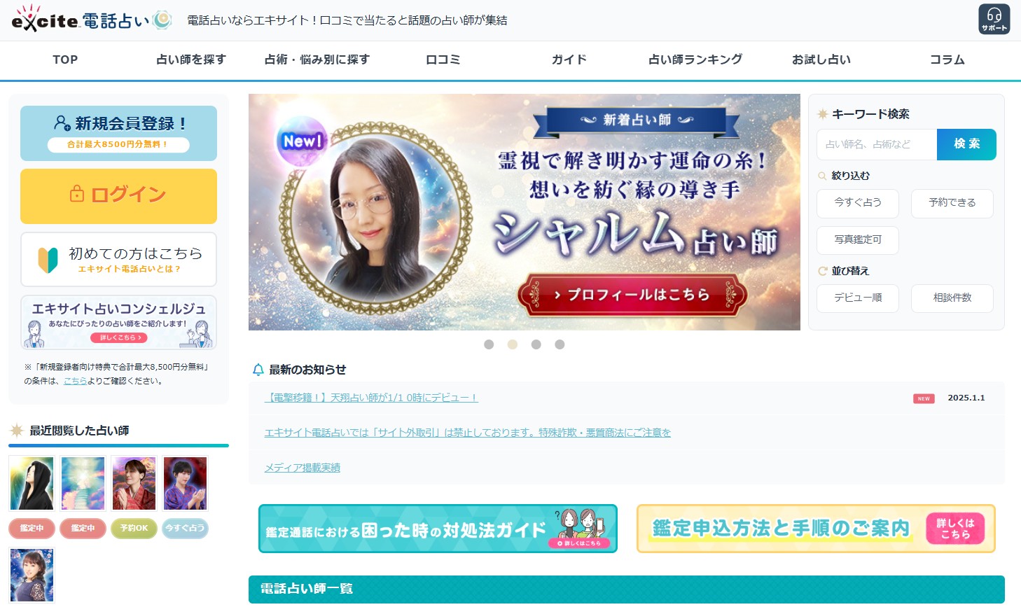 エキサイト電話占いは占術や相談内容などから、自分に合う占い師を見つけやすい電話占いサイトです。