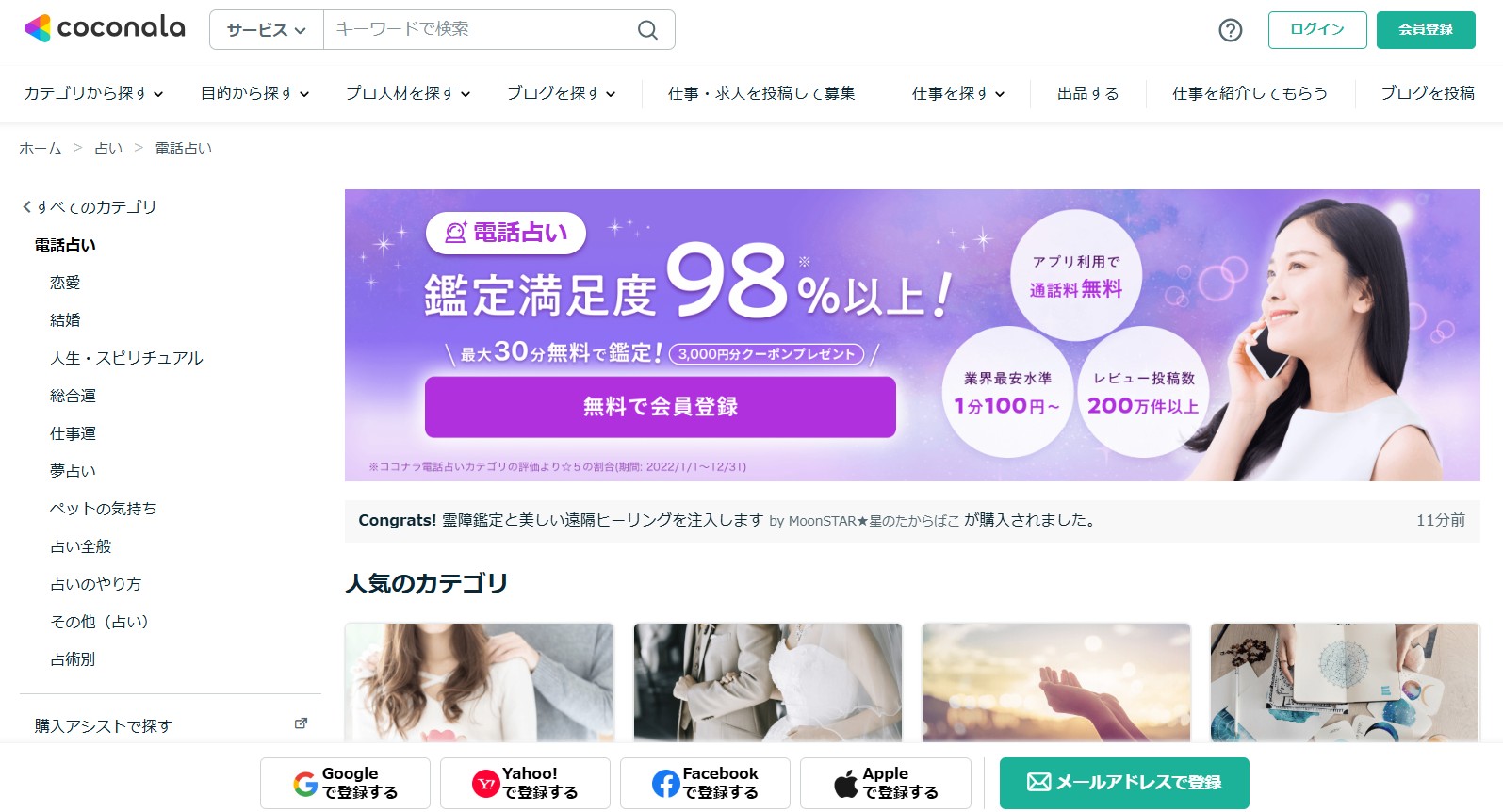 ココナラでは出品者が「電話占い」のコンテンツで売り出せば、誰でも占い師になれてしまいます。