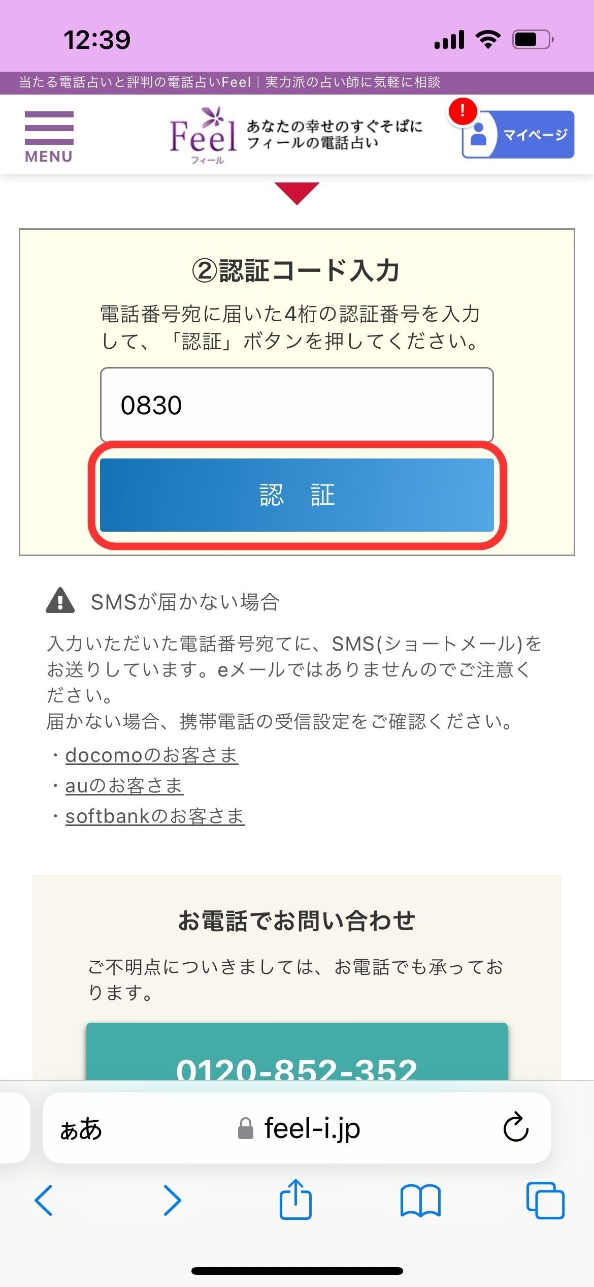![]() ![]() | ⑨「電話鑑定を依頼する」を押して予約完了 【鑑定開始】 |