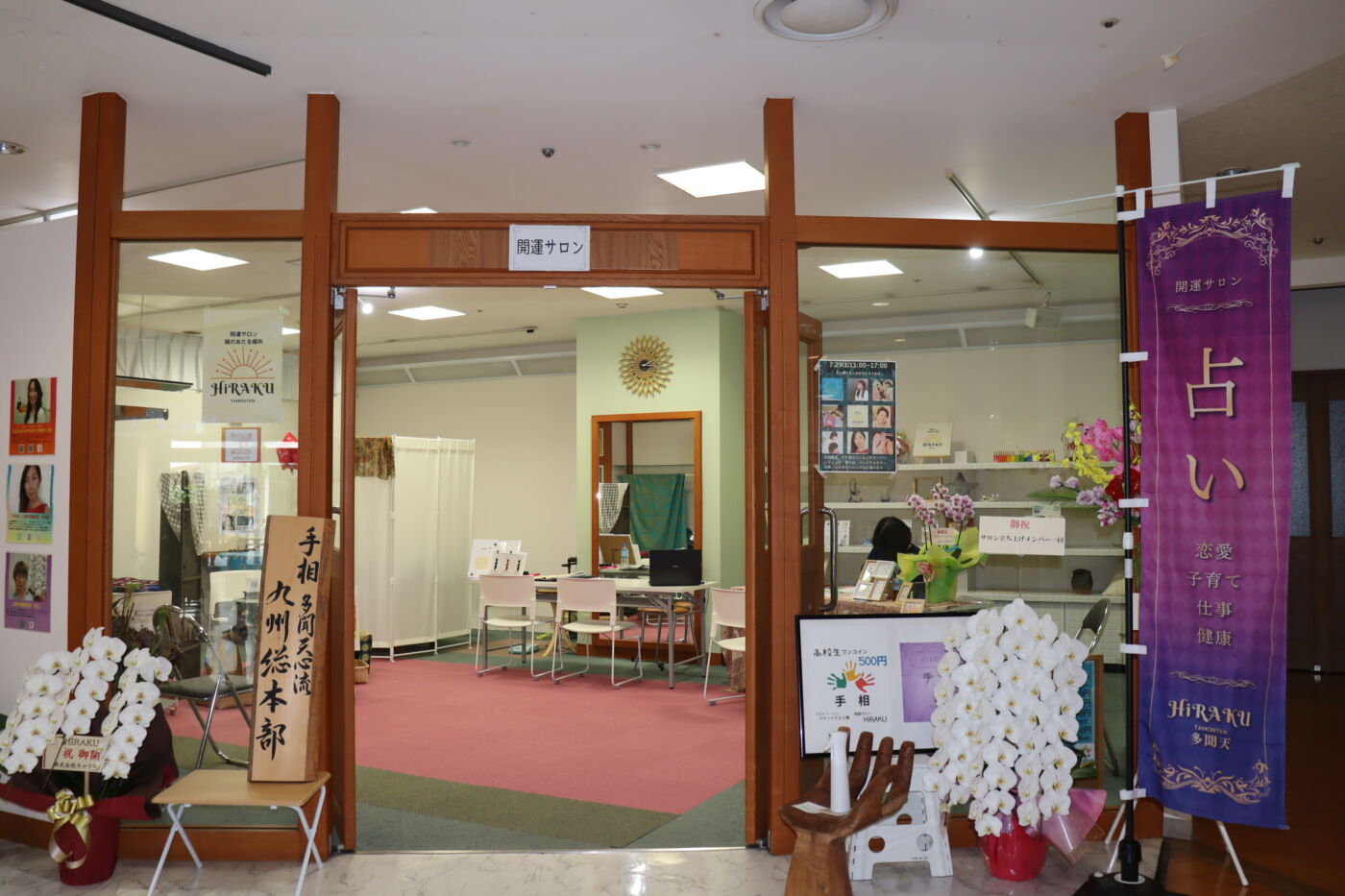 陽のあたる場所HiRAKUは宮崎のアゲインビルという商業施設内にあり、本格的な手相占いを楽しめる占い館です。