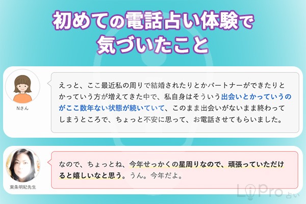 口コミ通り、アドバイスも的確かつ具体的で、明紀先生の快活な雰囲気と豪快な笑いに、電話越しに大きなパワーをもらっているような気さえしました。