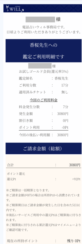 | かかった料金 | 3,080円(初回10分無料特典を利用) 440円×7分=3,080円 |