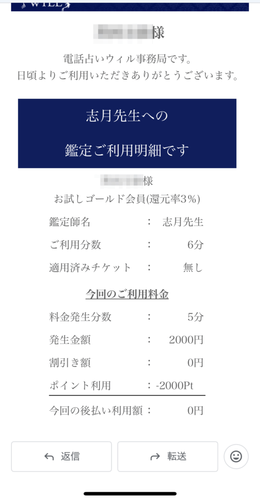 電話占いウィルの志月(シヅキ)先生に相談しています。相談者は初めての利用だったため、初回特典を使用しているため、鑑定料金が割引されています。